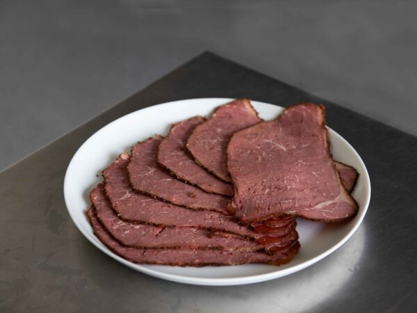 Sliced Pastrami, is a food originating from Romania usually made from beef brisket.
